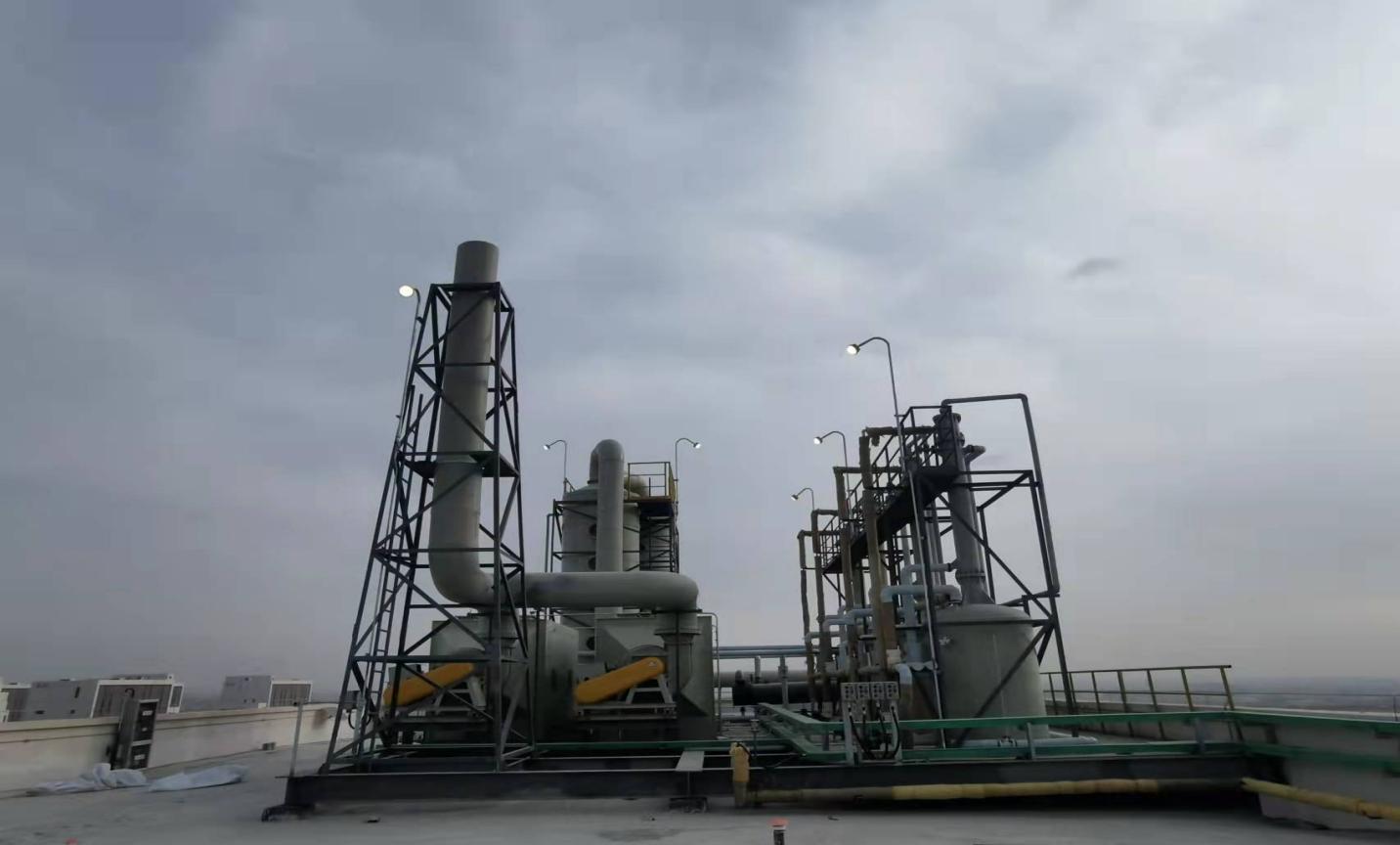 甘肅朗瑪旗云科技有限公司醫(yī)藥農(nóng)藥新材料中間體生產(chǎn)車間是化藥原料生產(chǎn)車間,車間生產(chǎn)過程中揮發(fā)的有機溶劑和物料粉塵對環(huán)境有較大的污染,根據(jù)環(huán)保部門要求,此類氣體需要收集后經(jīng)過有效處理才能排放。因此車間廢氣處理工作是重中之重,為確保未投產(chǎn)車間廢氣處理工程順利實現(xiàn)既定目標,項目部進行細致周密的施工準備。施工期間,項目部技術(shù)人員、業(yè)主在現(xiàn)場加強協(xié)調(diào)、監(jiān)督和指導(dǎo)工作,建筑工人們冒著嚴寒加緊作業(yè),確保工程進度,為項目順利完成進一步創(chuàng)造了條件。